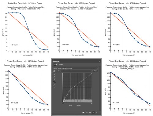 - Upper right. Two minor changes have been applied here. The exposure time for the positive transparency has been slightly extended by reference to the screen exposure time, while the second bath concentration is lowered to 42ºBé. The plot shows a slightly better distribution of the shadows steps. Extended exposure time prevents the quick etching of shadows because of the more diluted second bath.