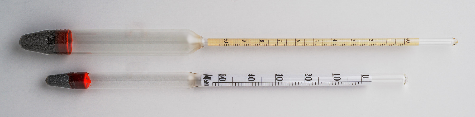 From previous explanations can be derived that in order to follow this two baths etching method it is necessary accurately measure the ferric chloride concentration. This can be only accomplished with the appropriate Hydrometers. The Fig., 3 shows two type of hydrometers both calibrated to measure at a 20ºC temperature. The shown at bottom measures from 0ºBé to 50ºBé with an accuracy of 1ºBé while the shown on top measures from 40ºBé to 50ºBé with an accuracy of 0.1ºBé. This one is the needed for the proposal of previous text.
