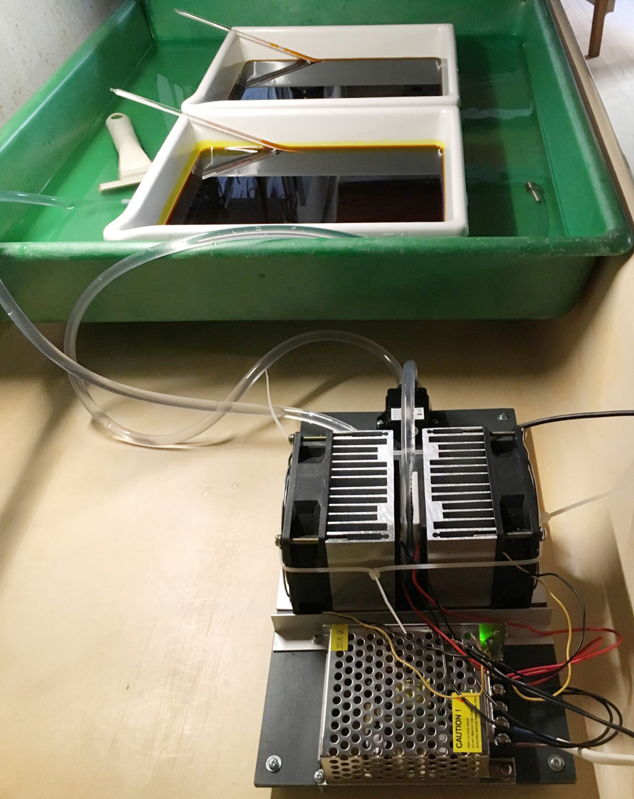 Nevertheless, if the ferric chloride dilutions have been prepared in the cold season, the only one limitation to be overcome is the refrigeration of the ferric chloride trays just the time necessary for the etching. Reducing the number of baths helps also with these constrains. Specially with plate sizes up to 24x30cm, a simple circulating refrigerator can be obtained from a couple of Peltier’s plates connected to a 12V power source. The Fig., 4 shows an installation with a water bath circulating through the Peltier’s plates and refrigerating the couple of ferric chloride trays. With accurate thermometers immersed in each ferric chloride bath it is quite easy to control the actual bath temperature.