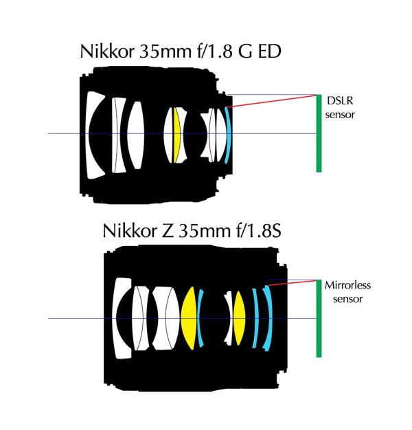 Let’s take an example comparing a couple of equivalent lenses from Nikon, being respectively constructed under the former (F) and the new (Z) mount specifications, the Nikkor 35mm f/1.8 G ED (F-mount) and the new Nikkor Z 35mm f/1.8S (Z-mount). The Fig., 1 shows as in the lens used with DSLR camera bodies the design is a classic retrofocus with marginal rays hitting the corner of the sensor at a moderate angle at the nominal FFD of 46,5mm. Below, on the same Fig., 1, the new lens with a much more shorter FFD of only 16mm, shows a completely new design (more telecentric). The marginal rays are even more perpendicular to the sensor surface minimizing the earlier stated constrains.
