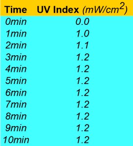 As can be clearly seen in the Table 1, after some time in between 2 and 3min, the output is stabilized. For practical purposes, a 3min of lamp heating will be safe to ensure reproducible exposures. The device is sensible enough to detect little output differences in the spaces between each other fluorescent tube. If a change for new tubes is expected, a previous measure of comparative outputs can be very useful to determine the exposure time for the first test.