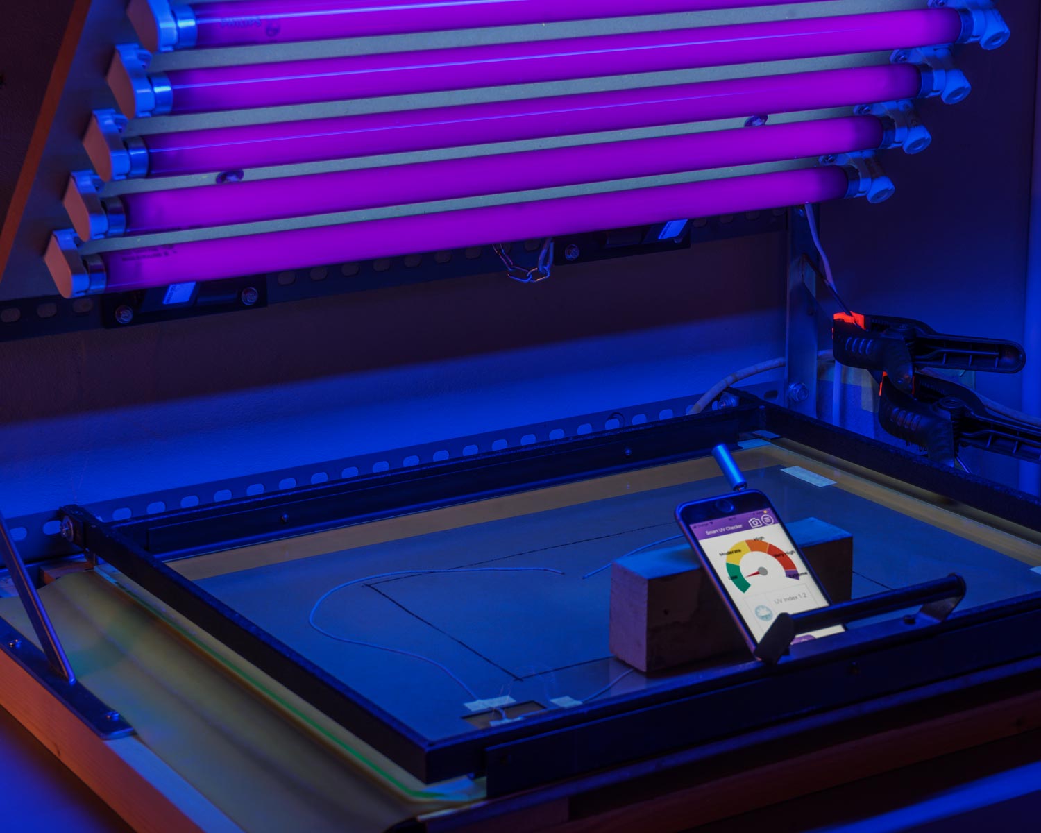 As a test to know which is the minimum time necessary to achieve a constant UV output, I placed the device under the BLB fluorescents bank. As because of the device size, iPhone plus the meter, it cannot be placed under the UV bank in the operation position, then it was simply placed at a fixed distance (Fig., 2).