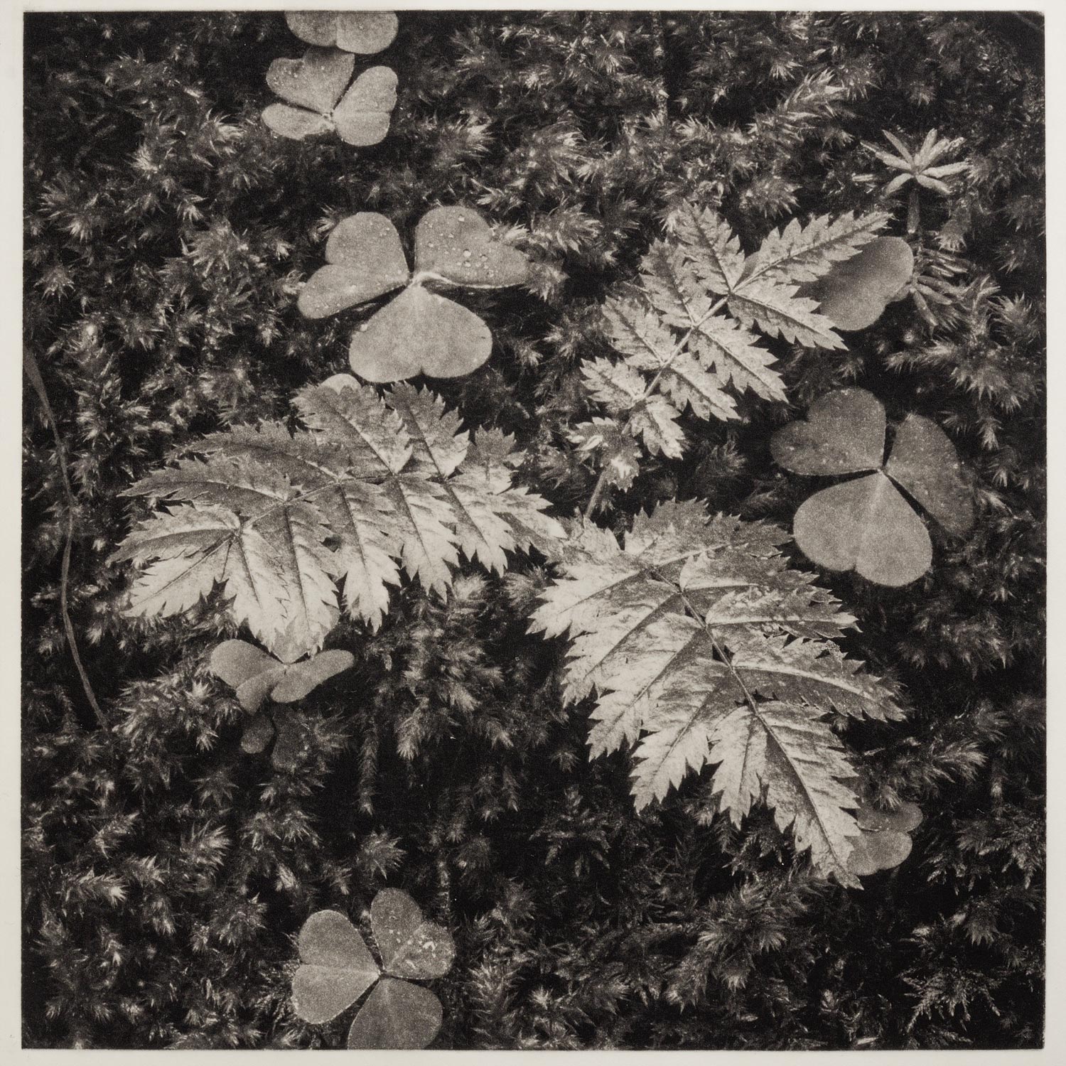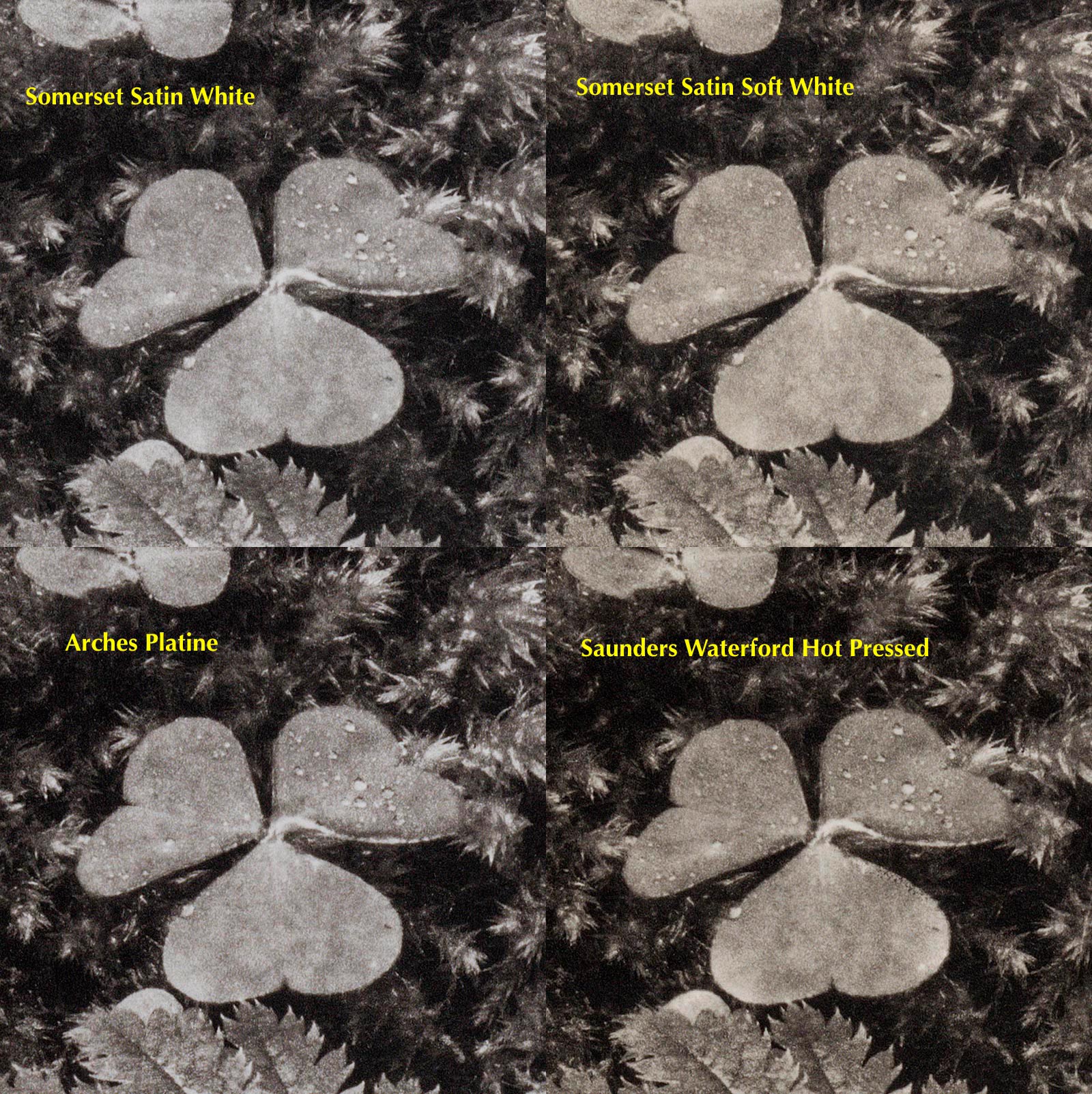 In the last post Heliogravure X – Black…?, what black?, there was discussed how the ink employed affects the black density and also how it could compromise the tonal range, among other factors. Here, we will try to look at how the same ink influences the picture over different papers. The plate chosen for this comparison is the “Leaves #7” of 20x20cm. The papers used are those listed below. Two are qualified as neutral white, while the others show a creamy-warm cast: