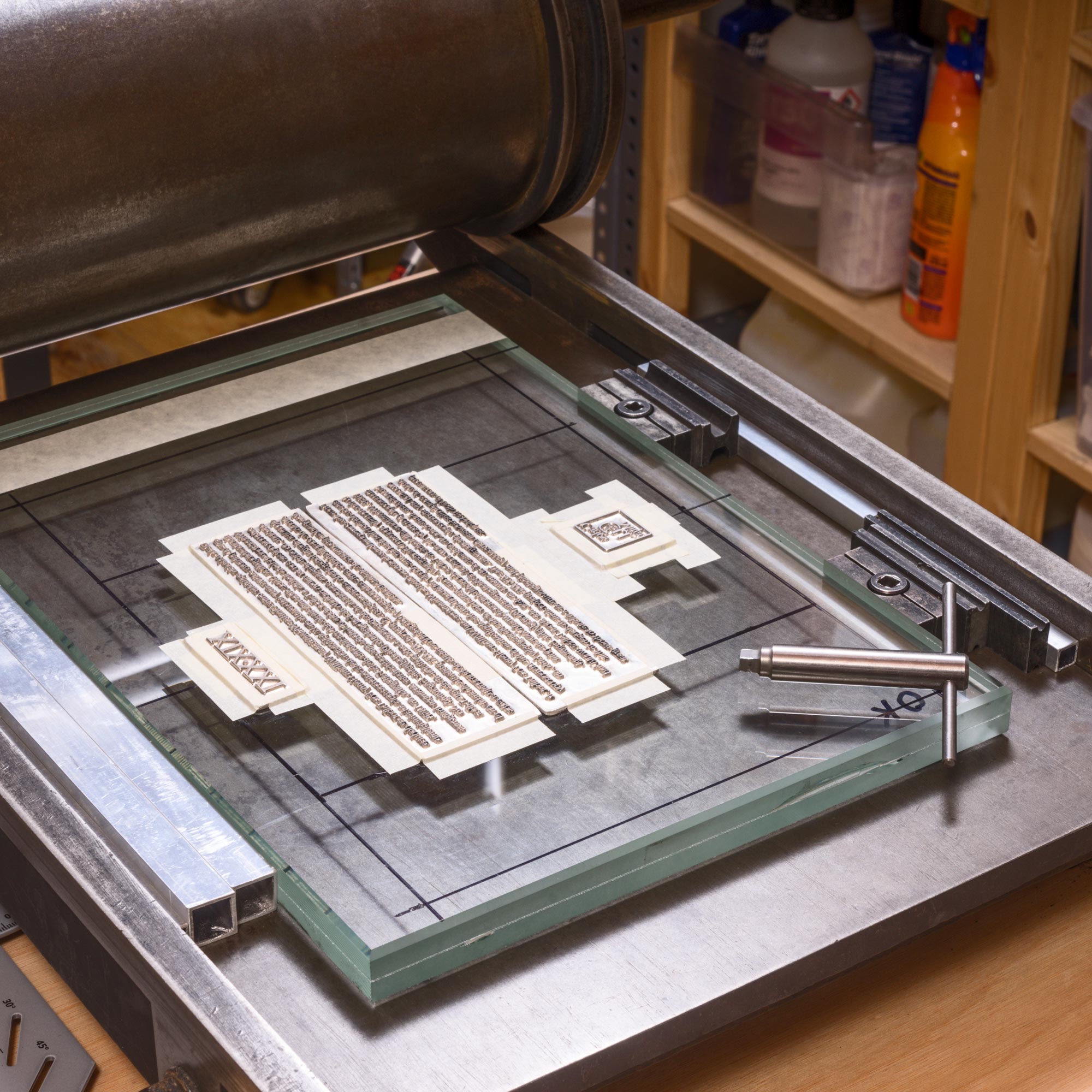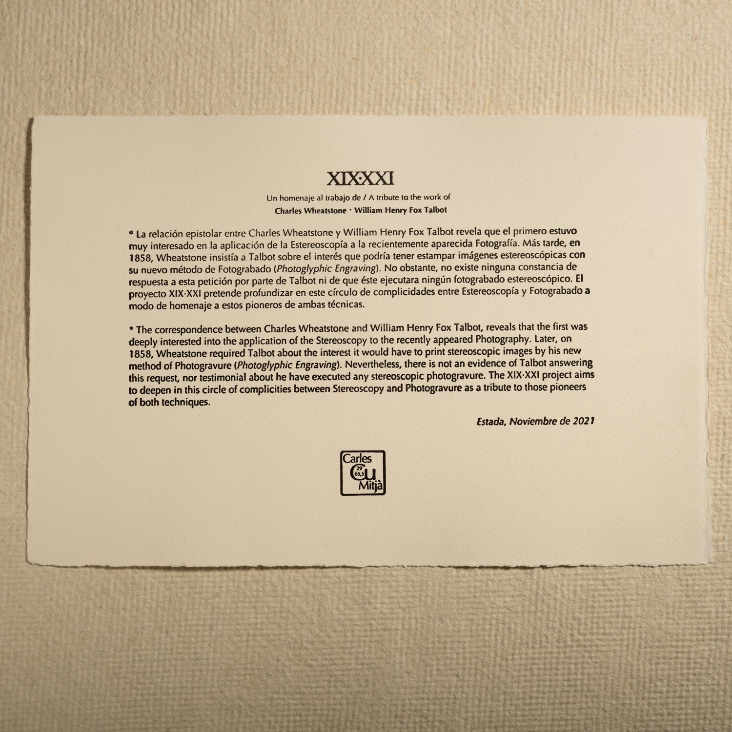El trabajo de heliograbado XIX·XXI sobre la relación entre el Heliograbado y la Estereoscopía incluye un texto explicativo de los motivos y hechos históricos en los que se sustenta. Después de la adquisición de la prensa de pruebas tipográfica antigua, éste es el primer trabajo de tipografía manual acometido. Aunque dicha prensa estaba en su momento concebida para trabajar con los llamados tipos móviles, hoy no es fácil disponer de un buen surtido de ellos al menos suficiente para tener libertad de elección. También debe tenerse en cuenta que dichos tipos ocupan mucho espacio del que no siempre se dispone. Por lo tanto, el planteamiento se basó en la preparación del texto en el ordenador y el encargo de una plancha de magnesio a un servicio de fotograbado. Como resultado de esta decisión, la prensa debía modificarse para trabajar con dicha plancha. Los tipos móviles de época eran de diferente altura según los países, pero siempre alrededor de los 23mm, mientras que una plancha de magnesio tiene un grosor de 3mm entre la base y la superficie de entintado. Para compensar esta diferencia y aunque la prensa dispone de tornillos de regulación en altura, se le incorporó una base de cristal de seguridad de 20mm que a su vez es la que recibe la plancha de magnesio (Fig., 1).