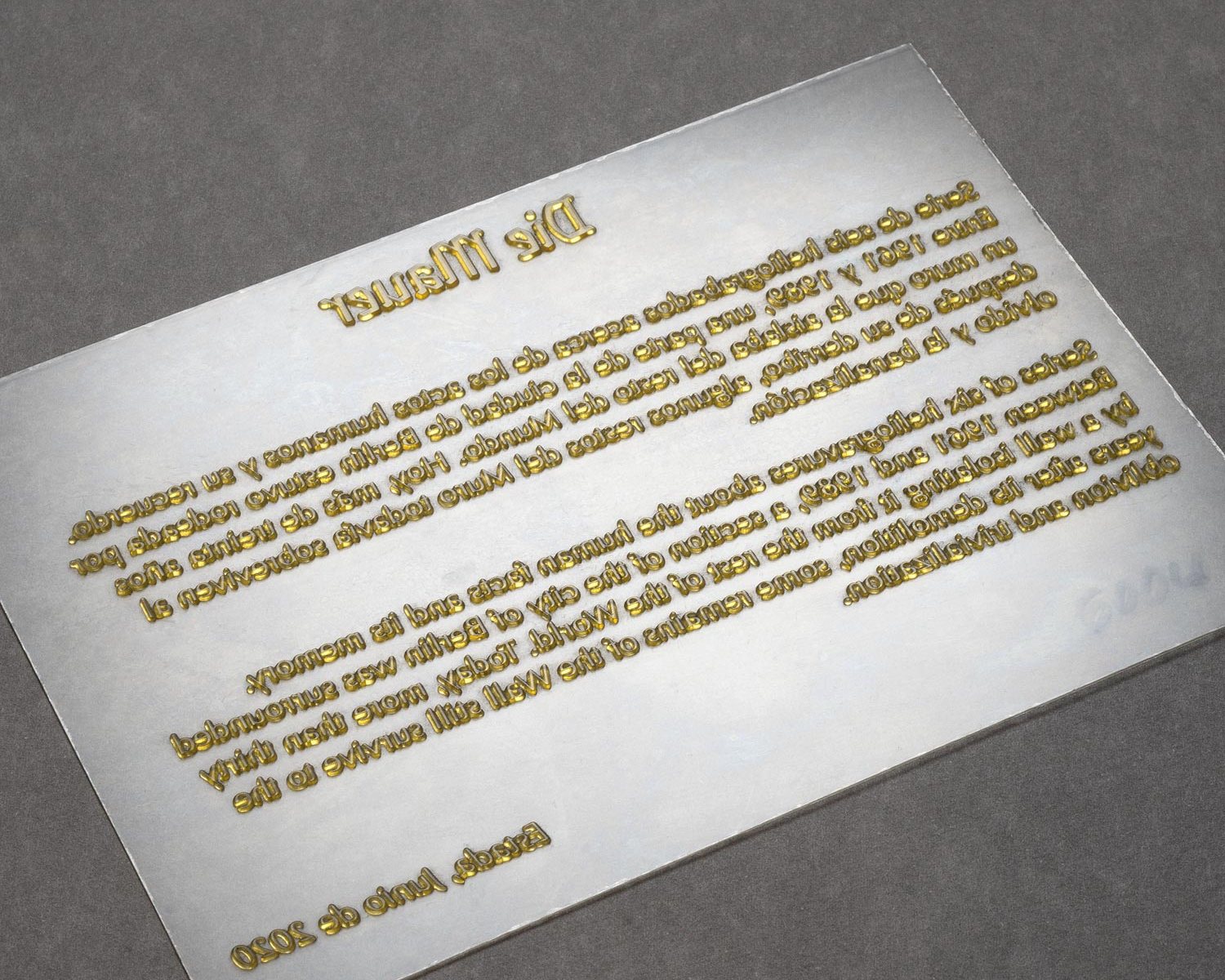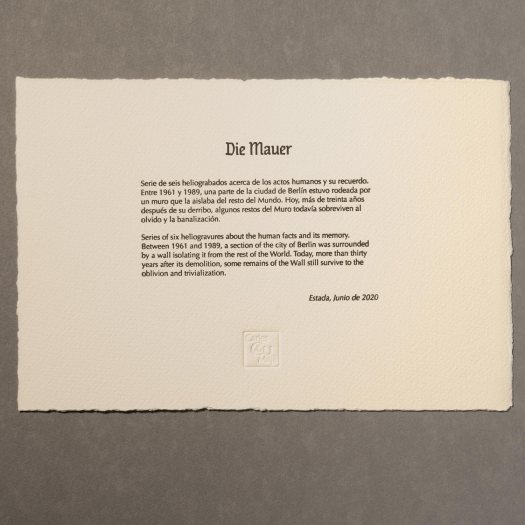Cada una de las seis cajas del trabajo Die Mauer incluye un texto acerca de las razones y el contexto en el que se originan las imágenes. Dicho texto se imprimió originalmente en un servicio de impresión comercial. Ahora, con la experiencia de impresión tipográfica manual del texto que acompaña al trabajo XIX·XXI, se ha probado de repetir la experiencia pero usando esta vez plancha de polímero en lugar de la de magnesio. La plancha de polímero se puede adquirir en multitud de comercios y resulta muy fácil de procesar. Ello permite abordar el trabajo sin necesidad del servicio de terceros.