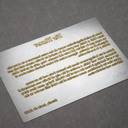 Once the plate has been exposed, it must be washed to remove all the non hardened polymer. This is done under tap water at 20º – 25ºC with the help of a soft nylon brush. During all those manipulations, including the washing, a safety yellow or orange light must be used avoiding any presence of blue or UV light. After check all the non hardened polymer has been removed (4 – 5min), the plate is thoroughly dried with hot air (50º – 60ºC). Finally, a second UV exposure is done. This second exposure must be at least as long as the first one. This ensures the final hardening of the polymer. In the Fig., 1 is shown a polymer plate with the text for the above cited Die Mauer work.