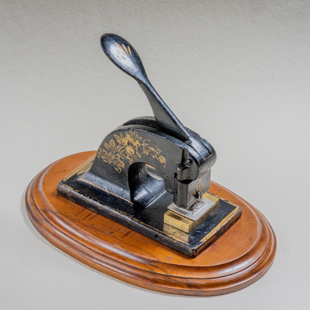 En la parte baja de la hoja se puede observar un logotipo gofrado obtenido a partir de una plancha magnesio y mediante el uso de la prensa de sello en seco que se muestra en la Fig., 3.