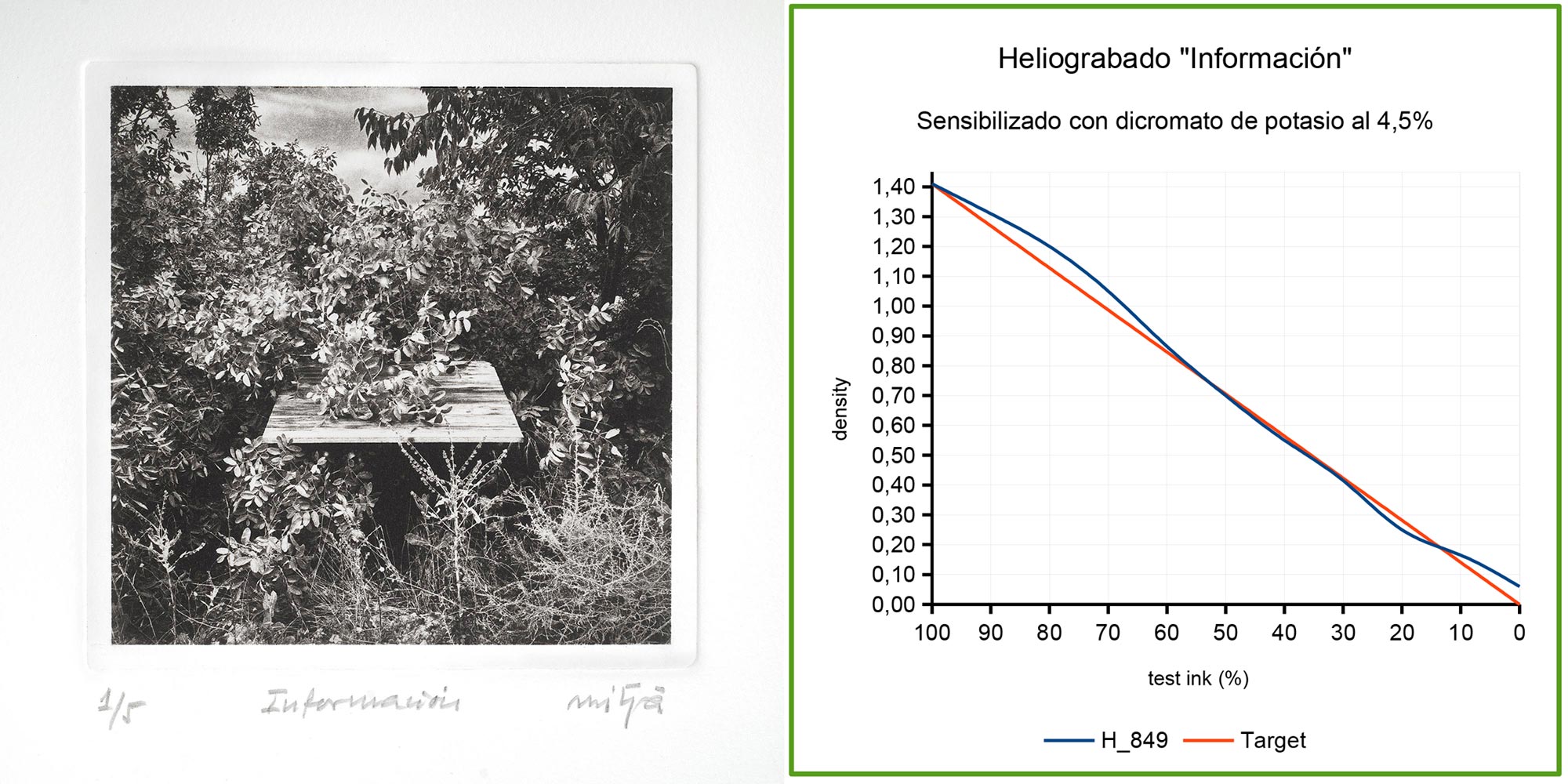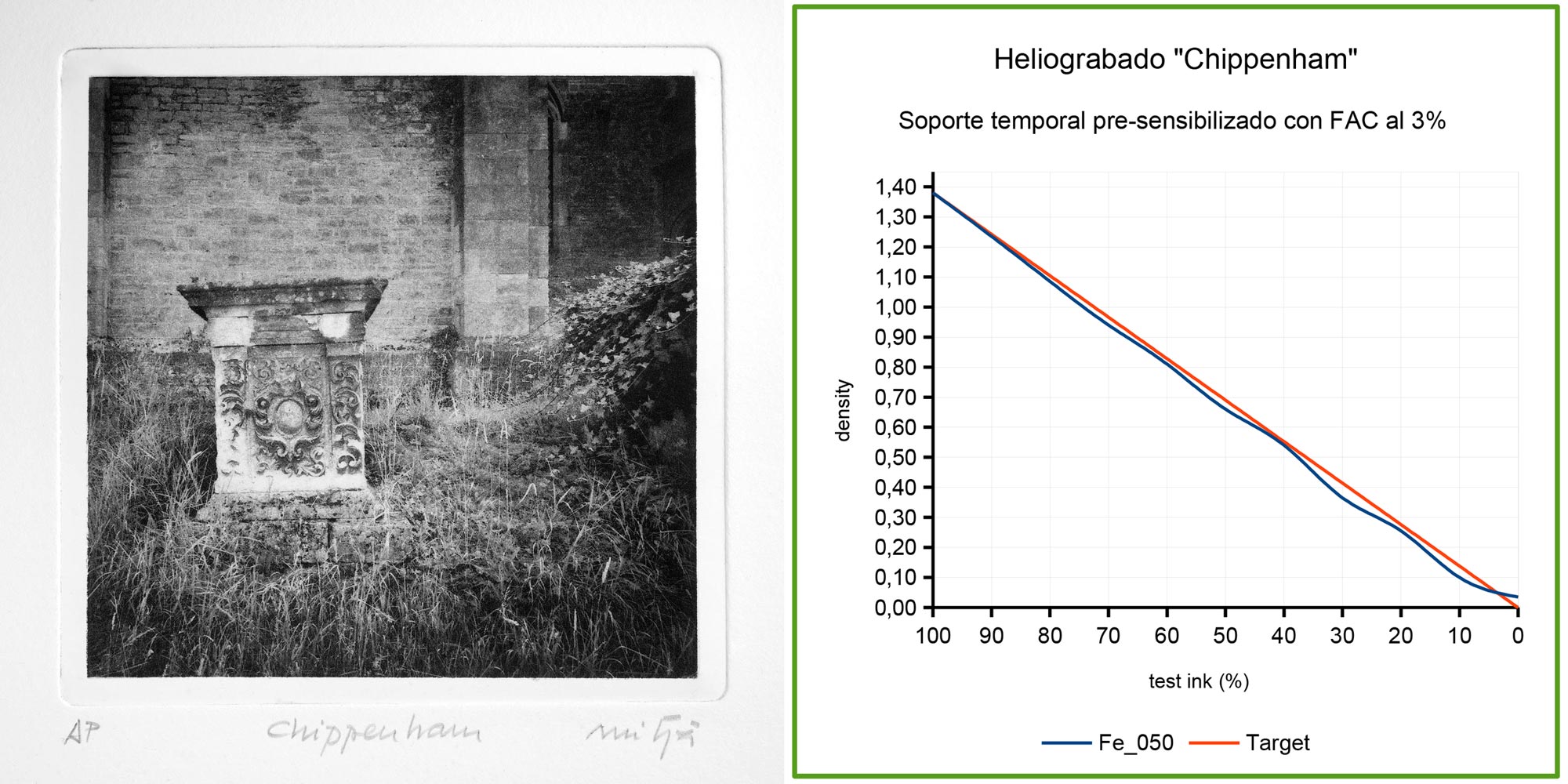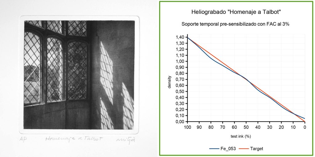 En la galería de imágenes se muestran las estampas “Información”, “Chippenham” y “Homenaje a Talbot”. Al lado de cada una, los respectivos gráficos de densidad de las estampas y la información sobre el sensibilizador empleado en cada una de ellas. Tal y como se indica, “Información” se obtuvo con dicromato de potasio como sensibilizante, mientras que para “Chippenham” y “Homenaje a Talbot” se utilizó el FAC.